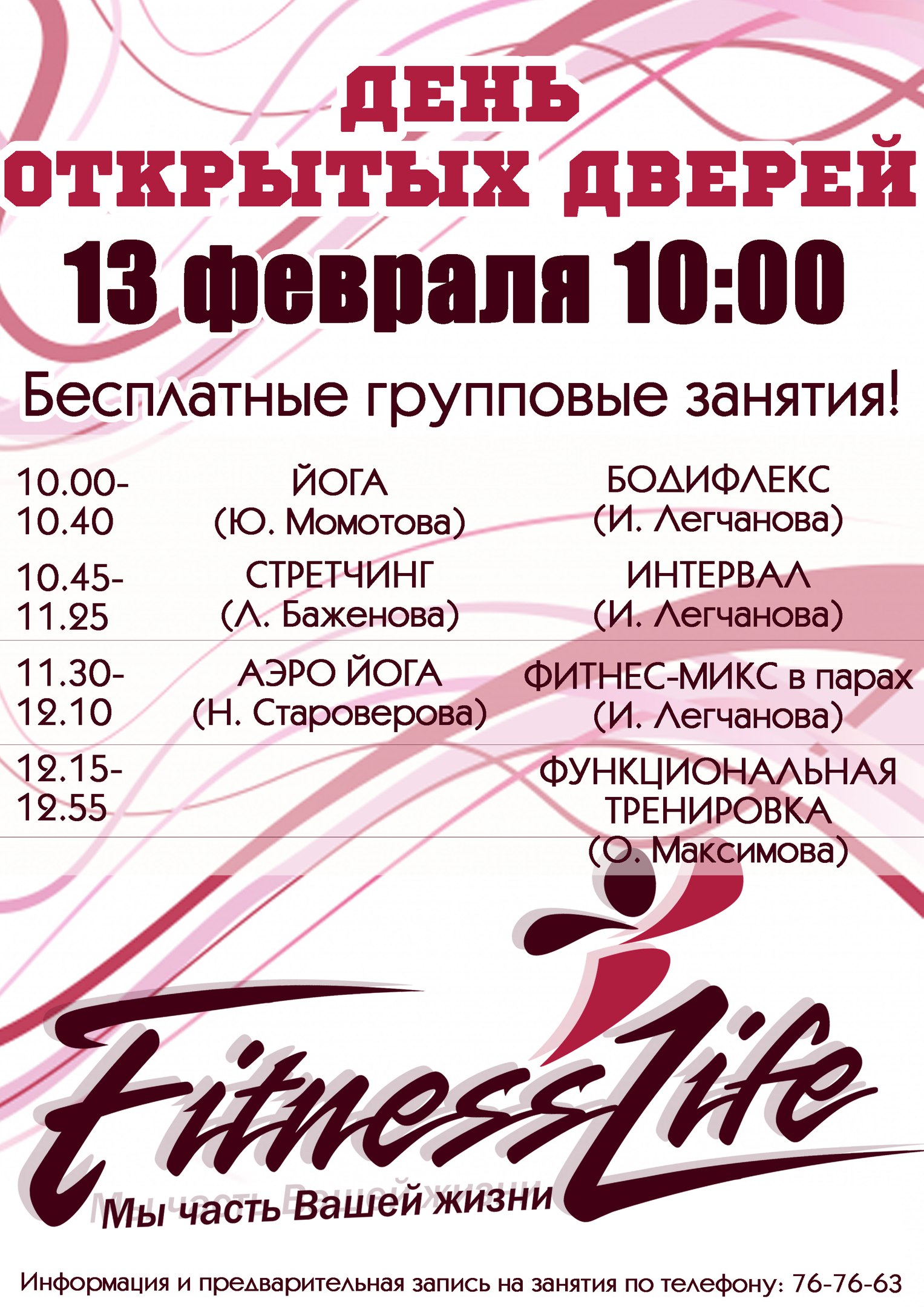 Друзья, Fitness Life приглашает на День открытых дверей 13 февраля (суббота)! Бесплатные занятия в залах групповых программ! Скидка -30% на абонементы по направлениям, представленным в расписании мероприятия (только 13.02.2016)! Информация и предварительная запись на тренировки: 76-76-63. Ждём вас!