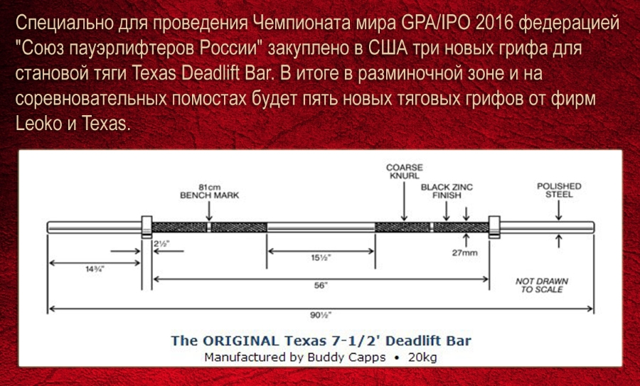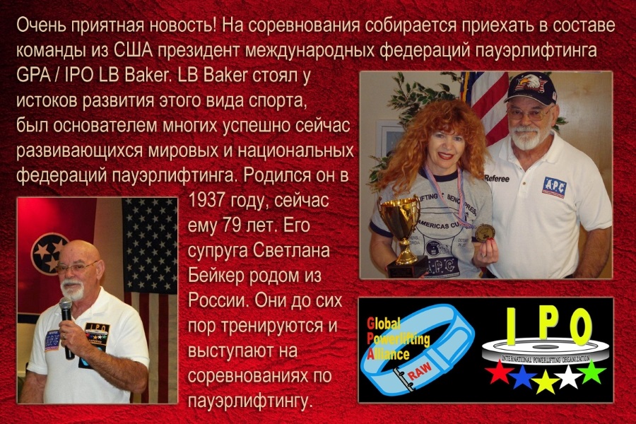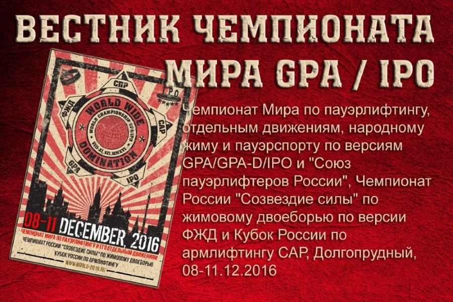 С 8 по 11 декабря 2016 года, в г.Долгопрудный (Московская область) пройдет - "Открытый лично–командный Чемпионат мира по пауэрлифтингу, его отдельным движениям, народному жиму и пауэрспорту по версиям федераций GPA/GPA-D/IPO и «Союз пауэрлифтеров России»." Официальный сайт www.world-2016.ru